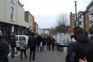 Looking north on Portobello Road, London. Saturday is the big day, and is advertised as "The World's Largest Antiques Market".