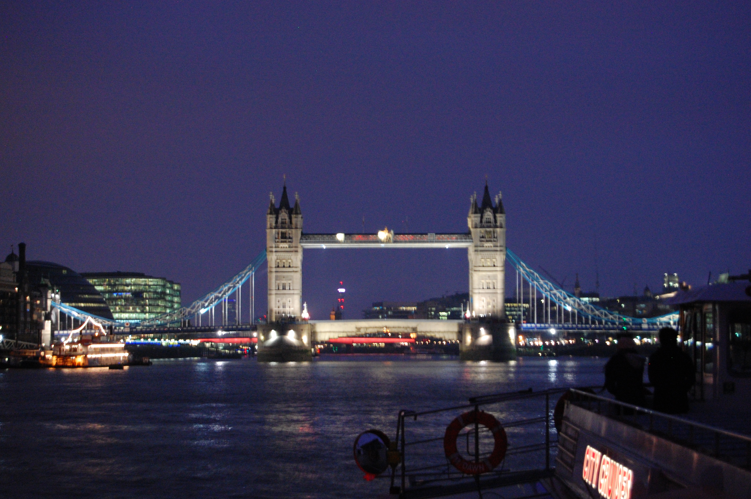 After a few pictures of the Palace of Westminster, we embarked on a sightseeing cruise down the Thames to Greenwich. It turned out to be another brisk day, especially once we got down by the pier. We were glad to stay inside the boat for the trip down to Greenwich. The trip took us past many landmarks along the way, such as the London Eye, Cleopatra’s Needle, St Paul’s Cathedral, Tower of London, Shakespeare’s Globe Theater, and HMS Belfast (another Imperial War Museum site). We had some delightful and interesting commentary from the pilot about the landmarks.  Once we got to Greenwich, we decided to just take the same boat back up to Westminster, since it was late in the day and there was only one more boat after the one we were on. It was starting to get dark as we left Greenwich, and as we got to the Tower Bridge, I was able to get one halfway decent shot: