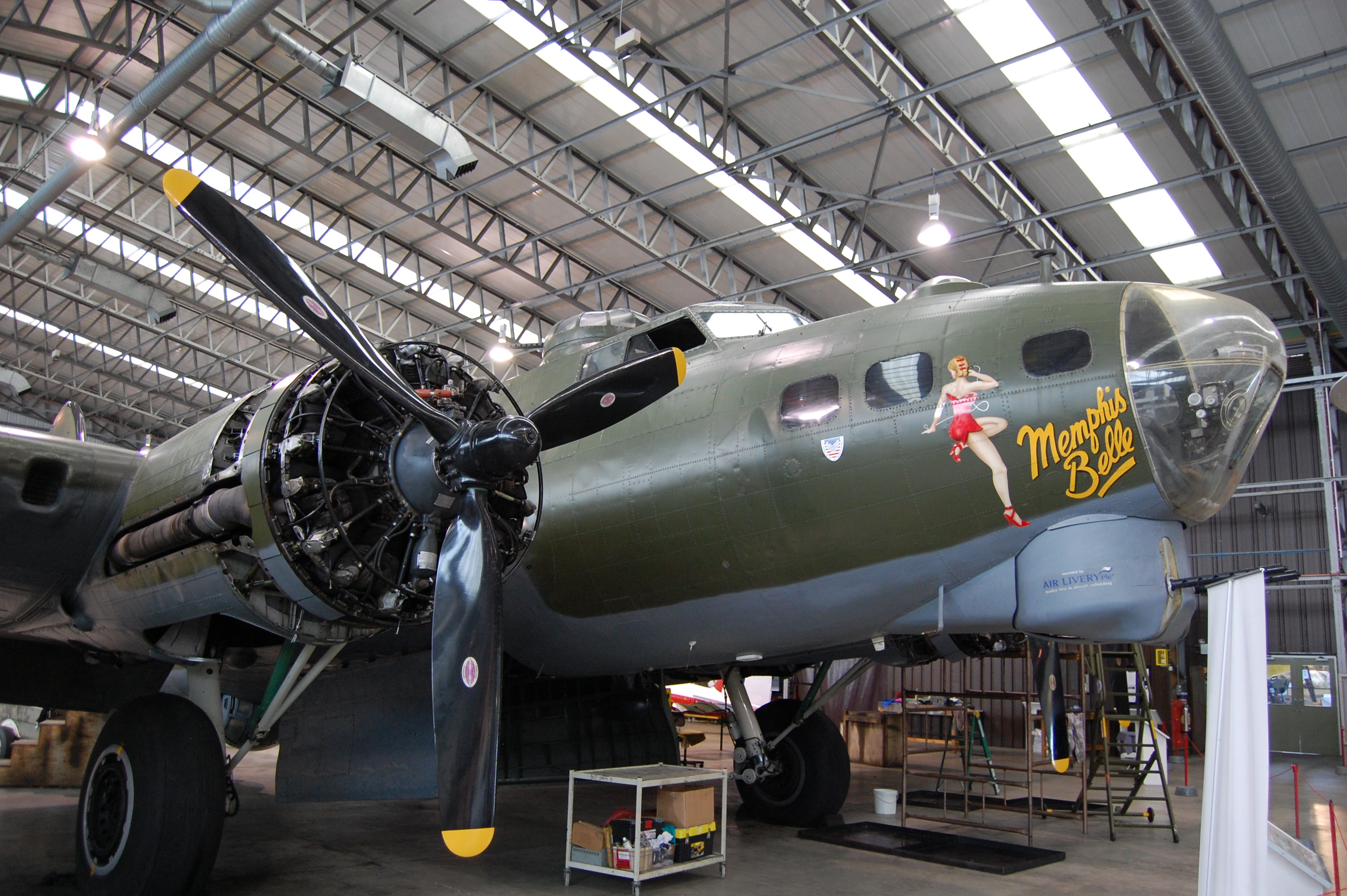 A Boeing B-17G, "Sally B", on display at IWM Duxford. This B-17 is the last airworthy B-17 in Europe. Although the picture shows this as "Memphis Belle", the other side shows a less clothed "Sally B". The nose art on this side is because this aircraft was used in the movie "Memphis Belle".