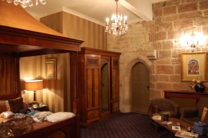 You might think that a castle, especially in the month of January in the north of England might be a cold and drafty affair but Langley Castle was anything but. Our room was warm and sumptuous. The bathroom was incredible – a walk-in “rain” shower, a sunken bath, and a small sauna. The double sinks would be handy later for a long needed round of clothes washing!