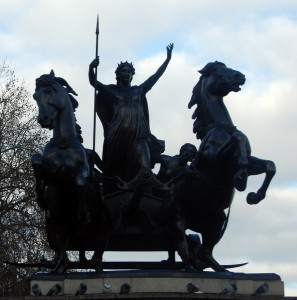 Boadicea, warrior queen of the Iceni tribe in Britain, led an uprising against the Romans in Britain around 60 AD. This statue, titled "Boadicea and Her Daughters", stands at the Embankment at Westminster Bridge. This picture was taken from the Big Bus as we passed it.