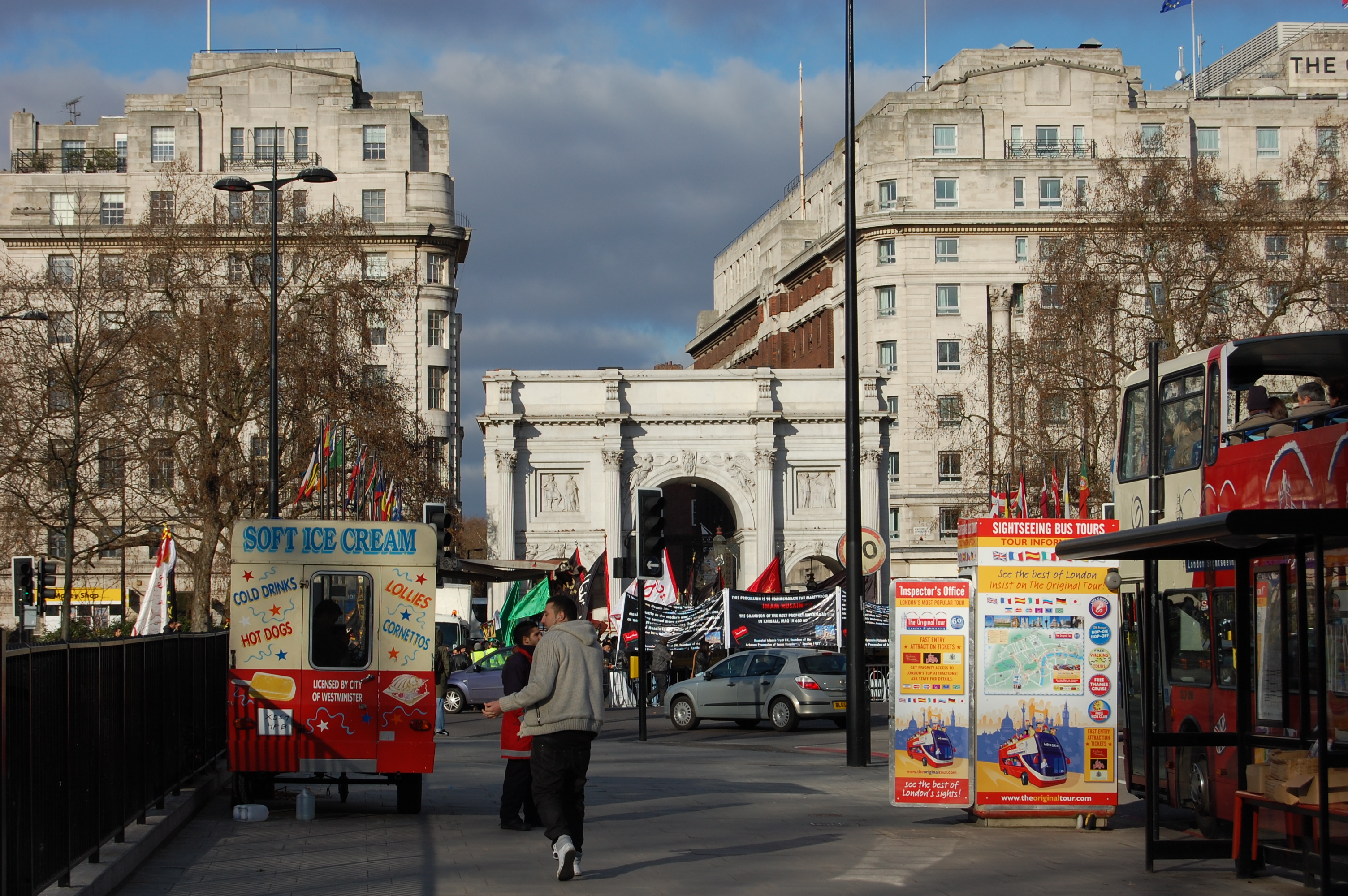 Marble Arch is busy even without a demonstration. One of the banners reads "This procession is to commemorate the martydom of Imam Husain, the grandson of the holy prophet Mohammad in Karbala, Iraq 680 AD".