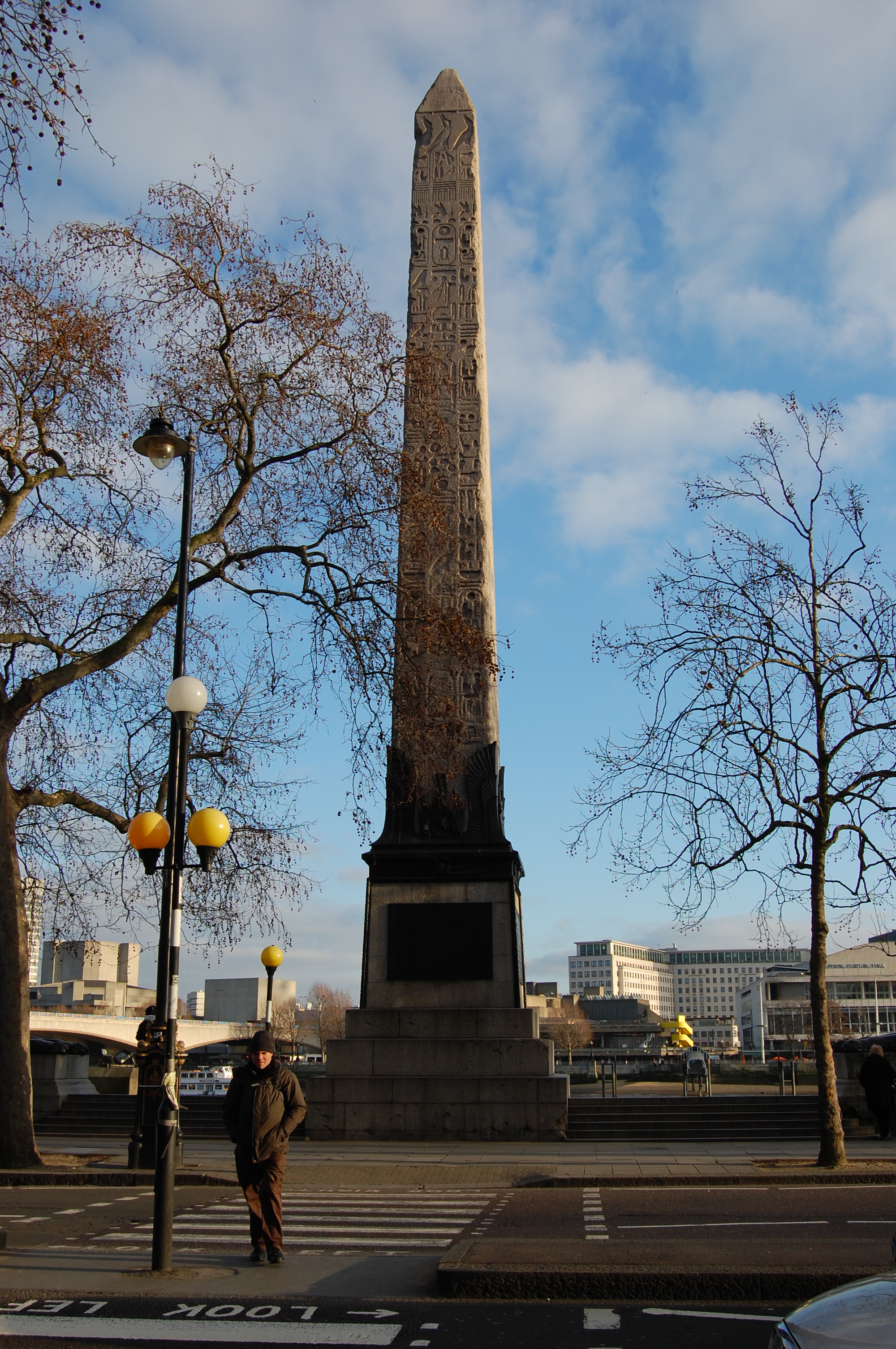 A view of Cleopatra's Needle in London, looking towards the River Thames from across the street, Victoria Embankment.